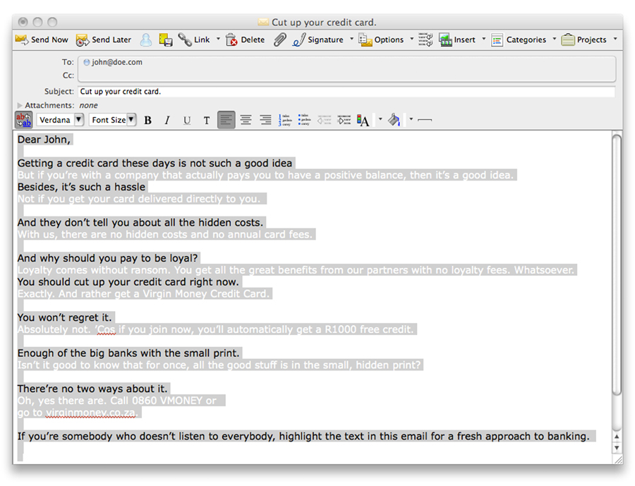 This 2-part emailer was created to counter the negative sentiment around credit cards in the country at the time. Virgin Money is a maverick brand famous for bringing a light-hearted approach to banking advertising.